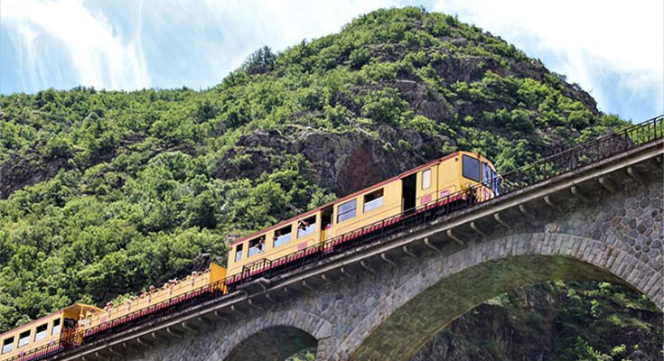 De Gele Trein, symbool van de Catalaanse regio en trots op de kleuren rood en goud, verbindt Villefranche-de-Conflent met Latour-de-Carol. Het biedt een unieke ervaring aan reizigers die er gebruik van maken. Aan boord van de trein ontdek je de Conflent, de Cerdagne en het grondgebied van het Parc Naturel Régional des Pyrénées Catalanes.